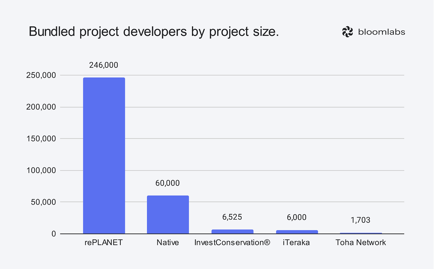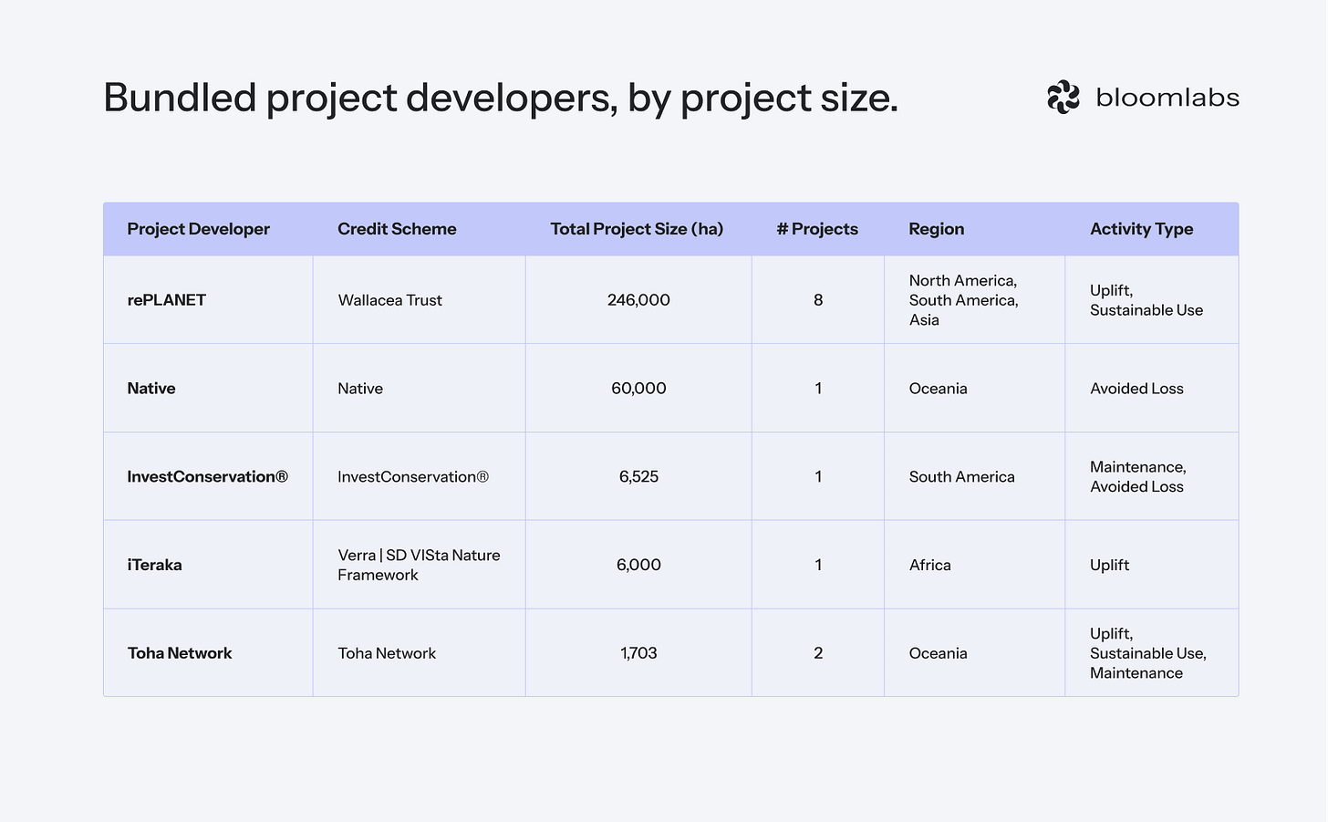 The projects that support bundling are once again led by rePLANET. They alone make up more than 76% of the total area for bundling-friendly projects with 246,000ha. The remaining 4 project developers cover the rest of the market.