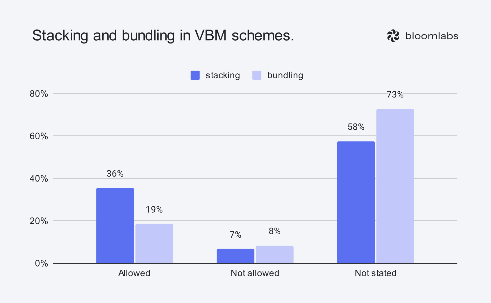 Out of 59 schemes covered, 21 explicitly support stacking. Out of them, 9 also support bundling and the rest either provide no information or do not support it. 11 schemes support bundling. Out of them, 9 also support stacking and the rest provide no information.