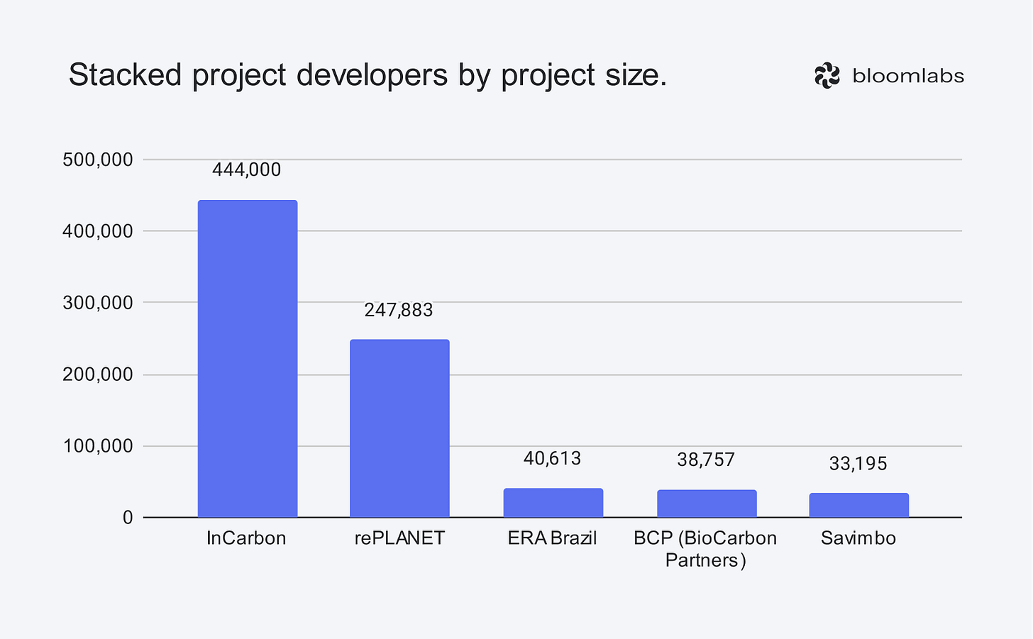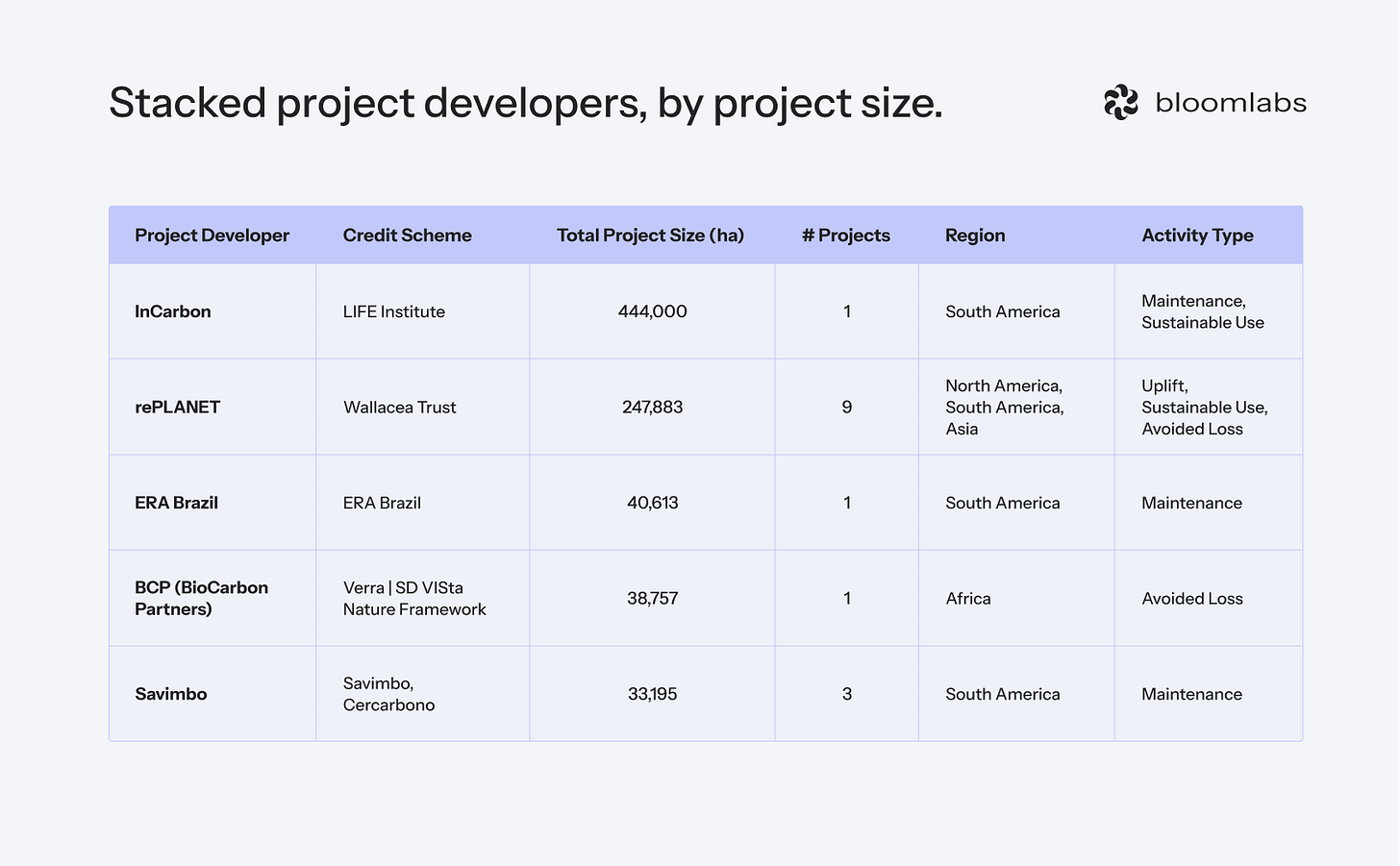 The projects that support stacking are dominated by 5 project developers: InCarbon, rePLANET, Savimbo, ERA Brazil and BCP (BioCarbon Partners). Together, they manage about 804,450ha, making up 92.8% of the total area for stackable projects.