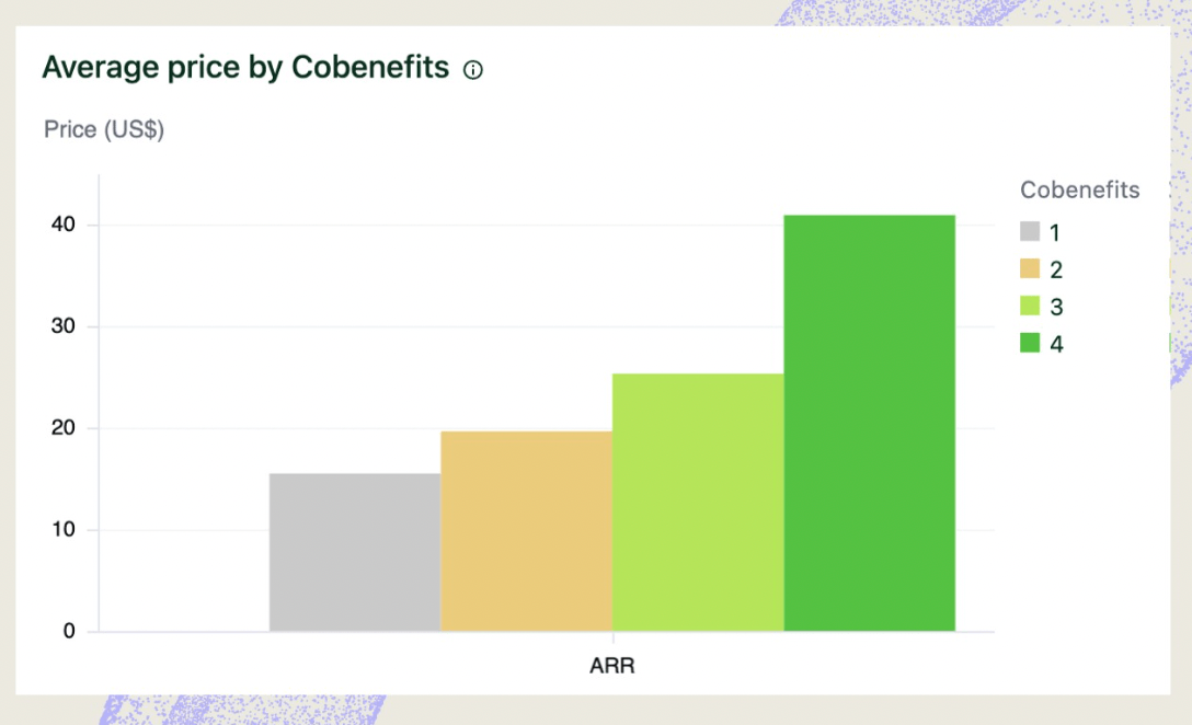 AlliedOffsets and Sylvera have recently illustrated the importance of carbon credit co-benefits (or implicit bundling) in numbers. Using AlliedOffsets’ data and Sylvera’s project ratings, they identified two key drivers of price premiums: quality (i.e. their own ratings) and co-benefits (i.e. social, biodiversity and community value beyond only carbon). For example, ARR (Afforestation, Reforestation, and Revegetation) credits with co-benefit score of 4 average a price of $40.18, while a co-benefit score of 1 is at $15.49.