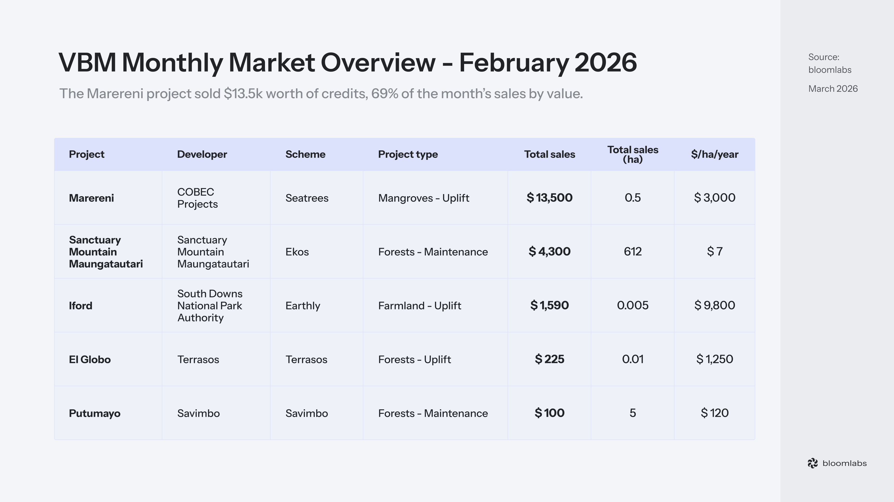 This month’s weighted average $/ha/year reaches $2,770, pulled up by the Marereni and Iford projects. Iford reaches $9,800/ha/year, Marereni sits at $3,000/ha/year, El Globo at $1,250/ha/year, Putumayo at $120/ha/year, and Sanctuary Mountain Maungatautari at $7/ha/year - spread from $7 to $9,800 across five projects in a single month. For reference, H1 2025 averaged $1,153/ha/year and H2 2025 averaged $1,468/ha/year.