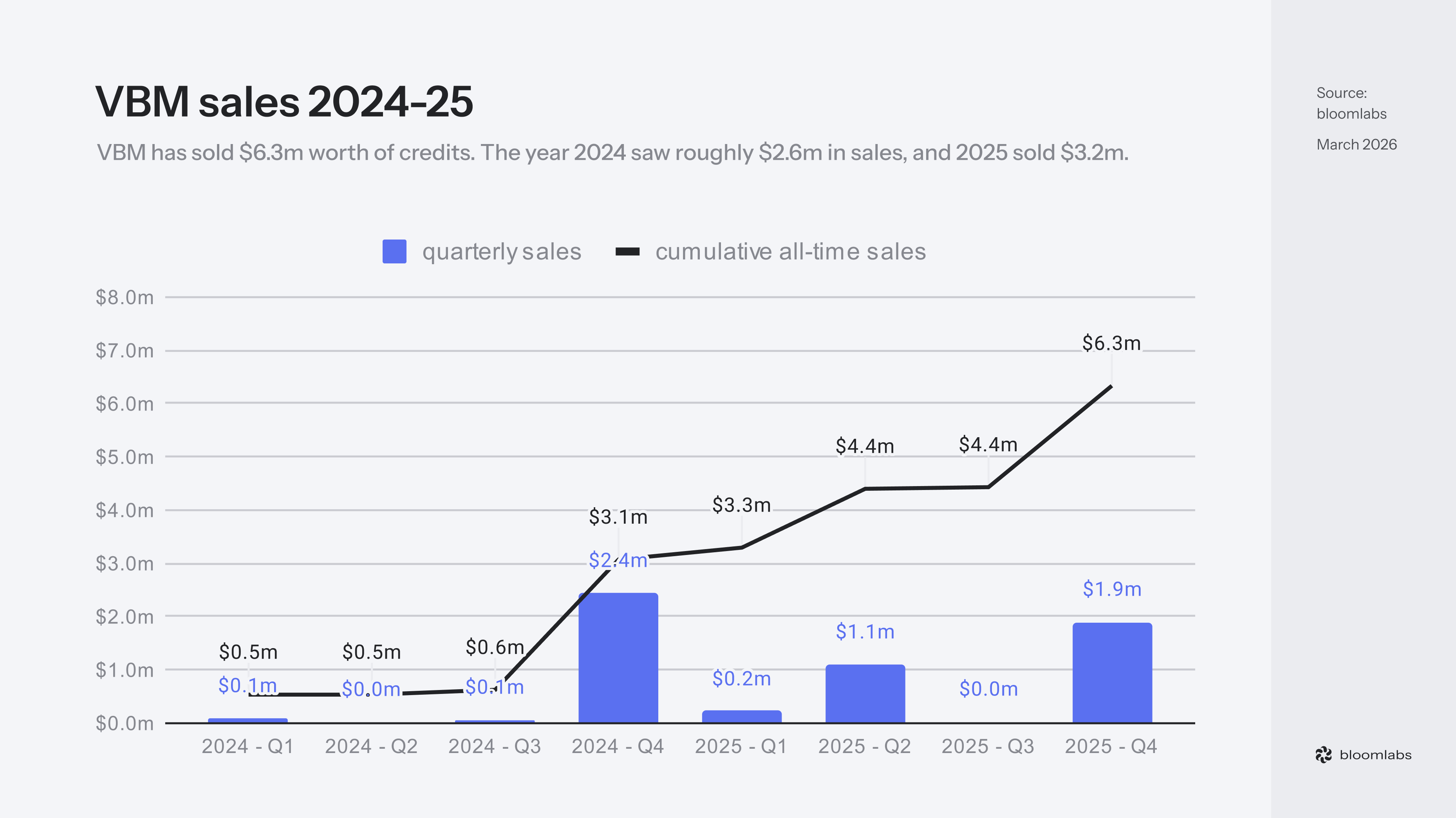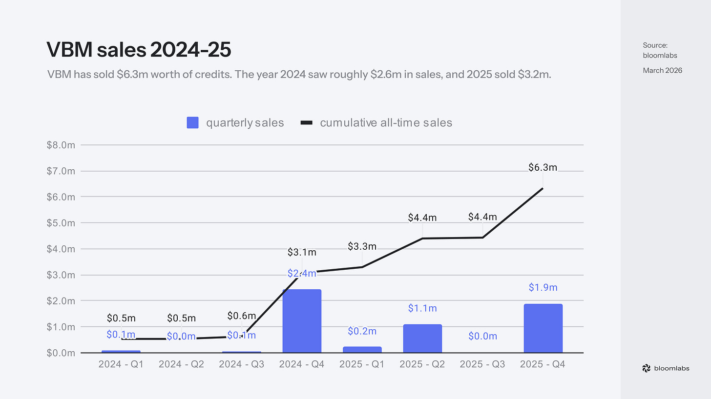 Adjusted for the Niue exclusion, VBM has sold $6.3m worth of credits since tracking began. However, a substantial part of VBM transactions happened over-the-counter (OTC) and have not been publicly announced yet. Hence, we believe the the actual total sales estimates to be around $10 million.
