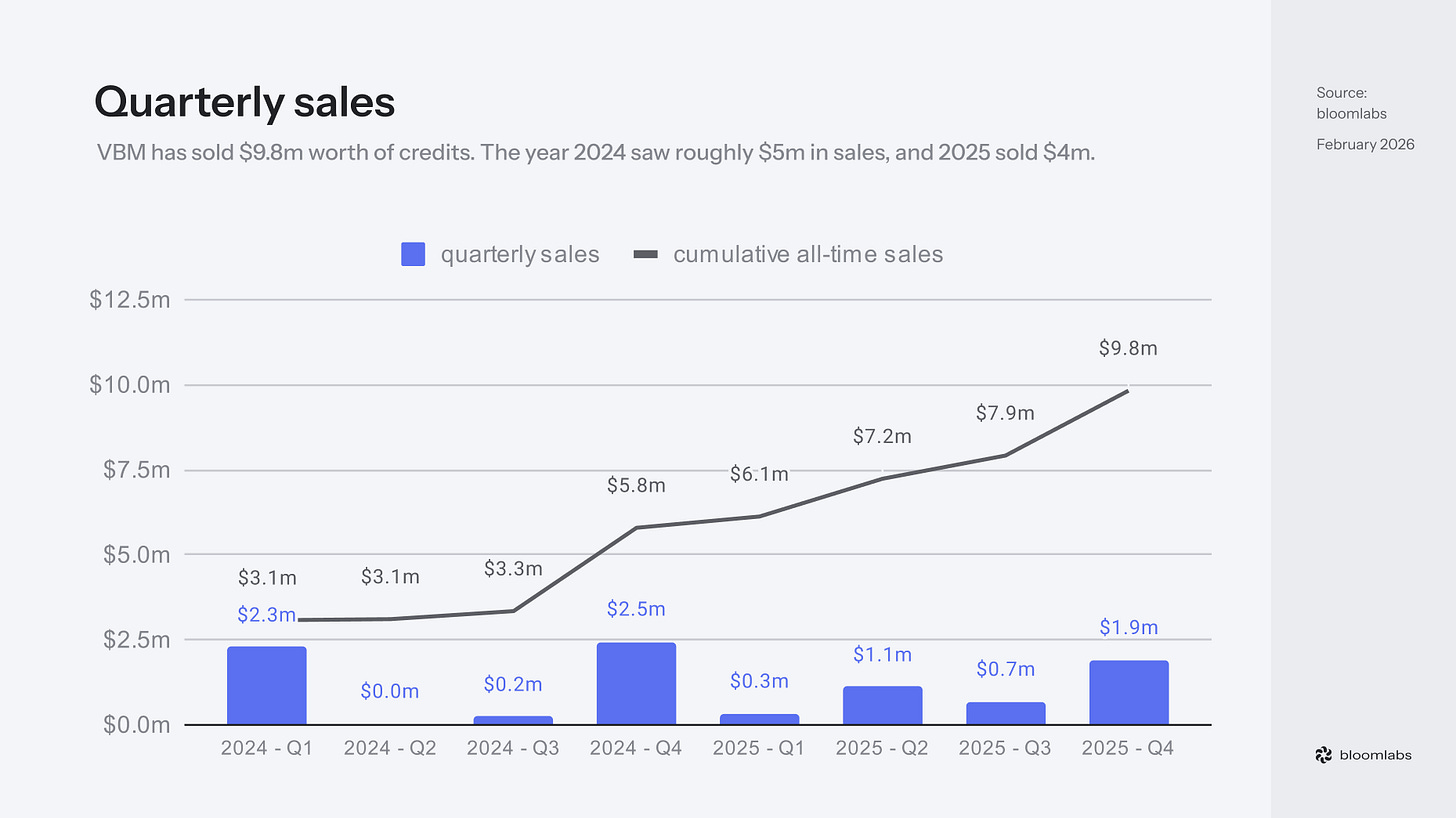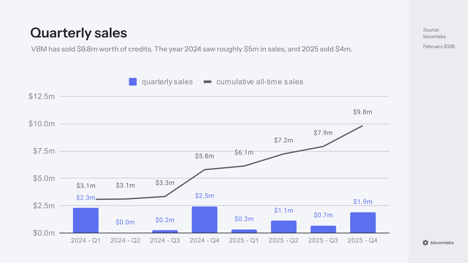 VBM has sold $9.8m worth of credits. The year 2024 saw roughly $5m in sales, while 2025 saw $4m transacted, but with a constant progression from $0.3m in Q1 to $1.9m in Q4. However, two large aggregated records that consist of multiple transactions are to be noted: a $2.2m aggregate for the Niue Moana Mahu project in Q1 2024 and a $1.1m aggregate for Wilderlands’ projects in Q4 2025. Hence, quarterly trends should be treated with caution until more granular information can be collected.