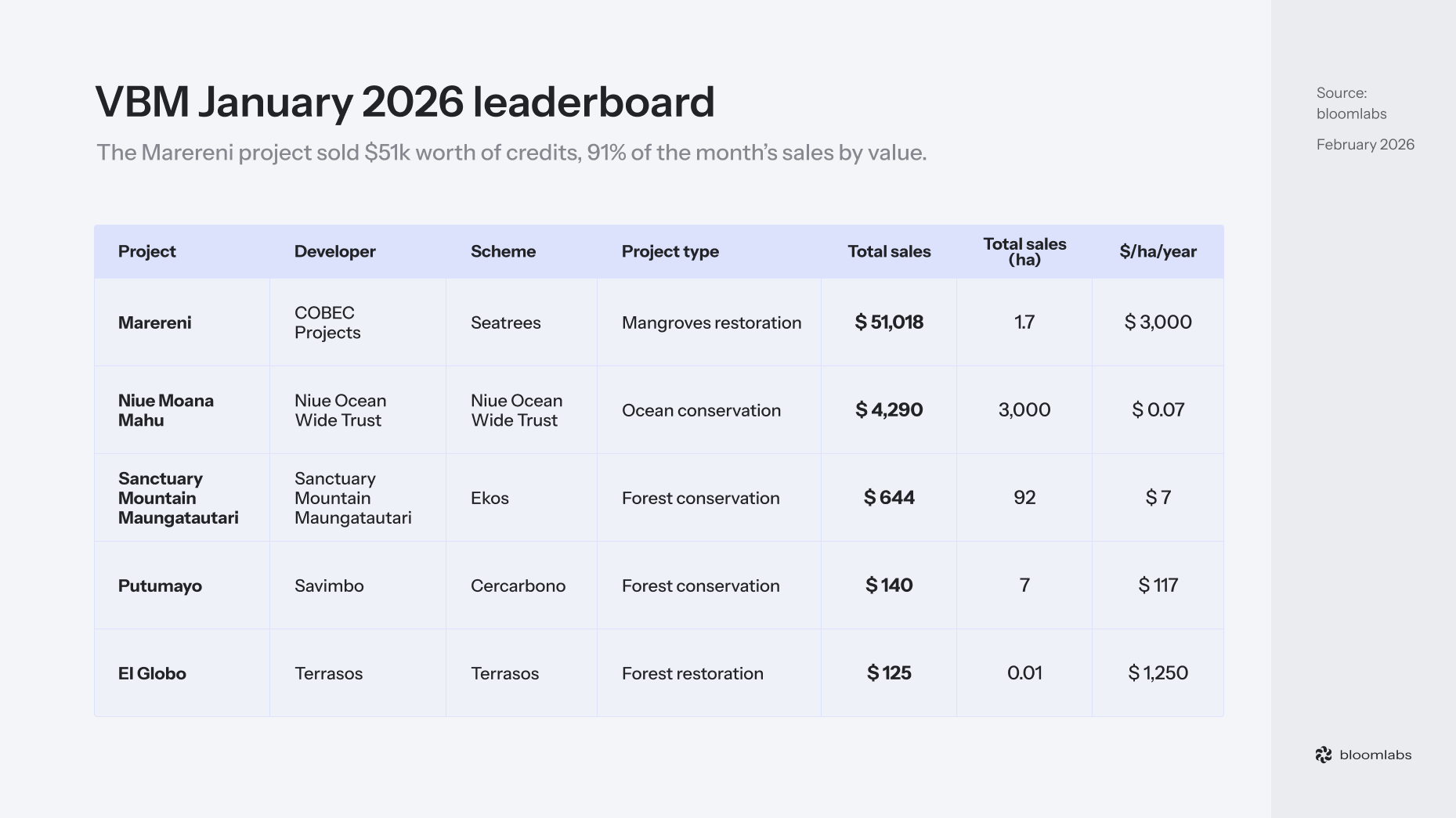 2026 starts on a slow but steady note for the Voluntary Biodiversity Market (VBM) with more than $56k in recorded sales for January, doubling the previous month’s total, led by Seatrees, Niue Ocean Wide Trust, and Ekos. The market headlines showcase a continued trend to standardize the tools, the assessments, and the outputs of the market’s projects.