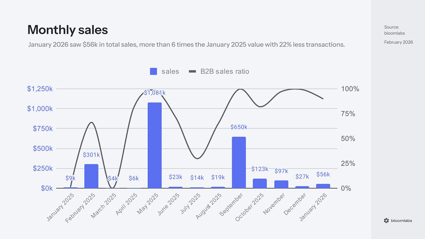 Sales were 90% B2B and confirm a growing trend, as this type of purchase only represented on average 53% for the first half of 2025, and 79% for the second. The growing B2B engagement rate is a positive sign of corporate interest, but it has yet to show up in tangible dollars spent, as the average transaction value ($900 for January) has been on the downside since September 2025. It is, however, still 8 times higher than last year.