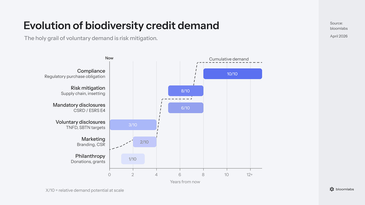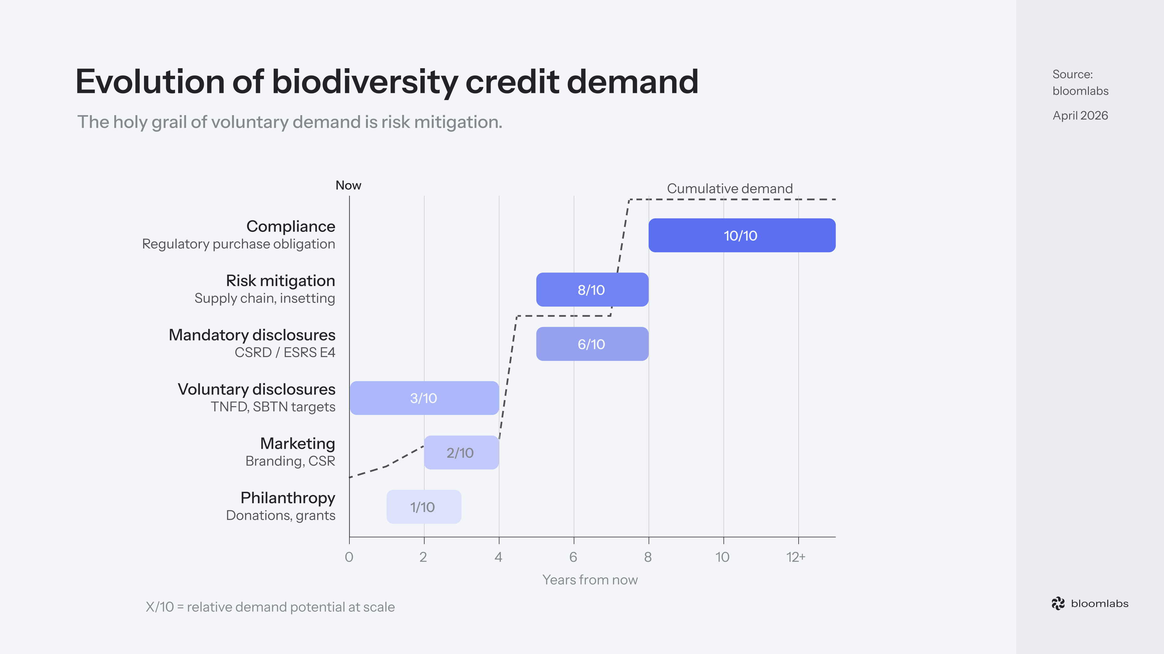 It is a raw representation but the idea is that different credit demand drivers exist: different reasons, timelines and, most importantly, scales. The holy grail of voluntary demand is risk mitigation (if a market structure around it can be designed) while the compliance counterpart is a mandatory biodiversity credit market.